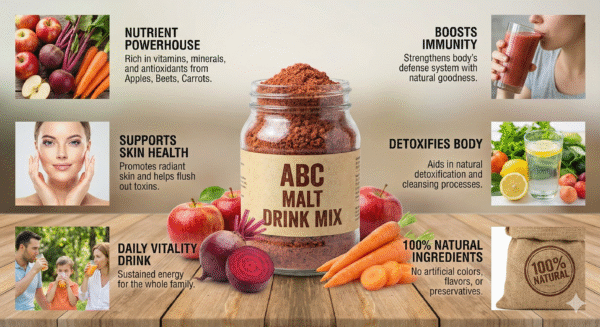 Unleash daily vitality with our potent ABC Malt, packed with the goodness of Apple, Beetroot, and Carrot. This delicious, vitamin-rich blend naturally boosts immunity, purifies the blood, and supports sharp vision. Mix hot or cold for a convenient, energizing drink that keeps you and your family healthy all day.